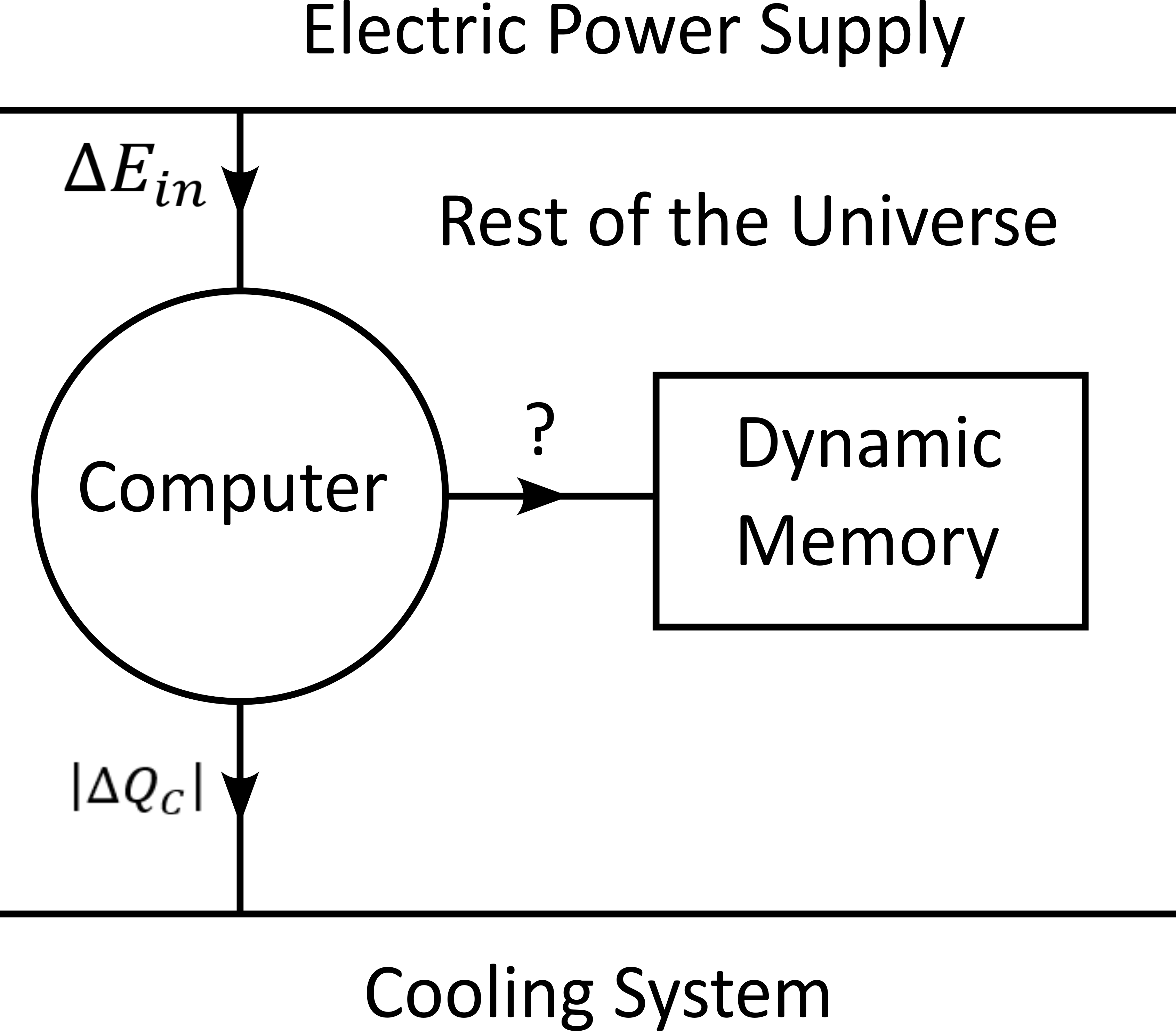 Where the subscript \(Rest\) refers to the rest of the universe. As mentioned above, the entropy change of the computer over one cycle is zero. The entropy change for the total system reads then