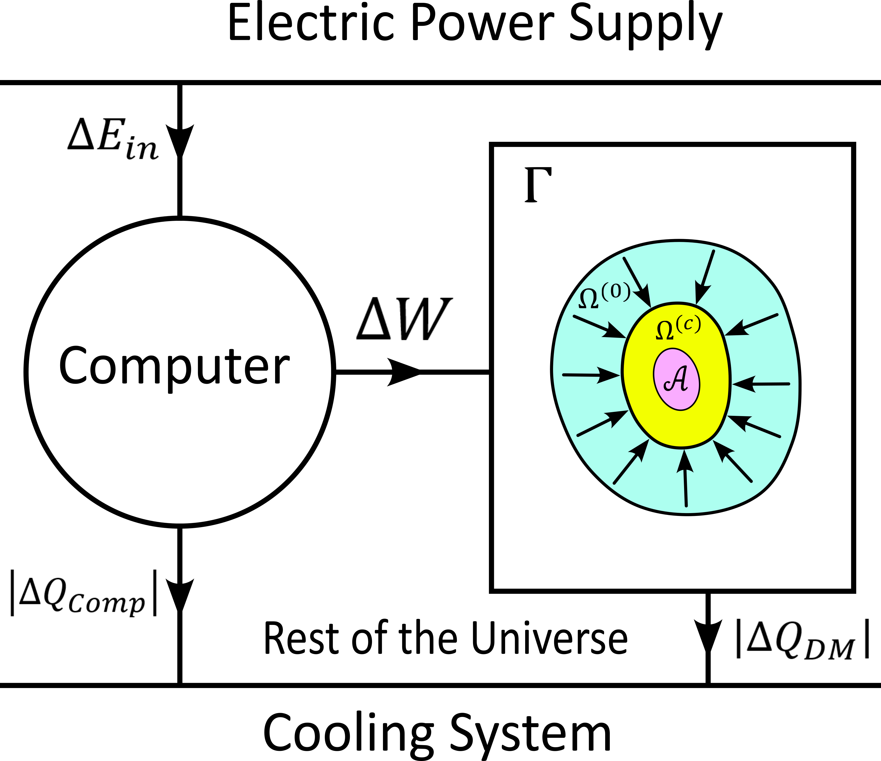 During an algorithm is running, electrical energy given to the computer and is expelled as heat in the cooling system, which may be interpreted as the cold reservoir. In order to make an analogy between the computer and the heat engine, we define the following virtual partition of the universe: