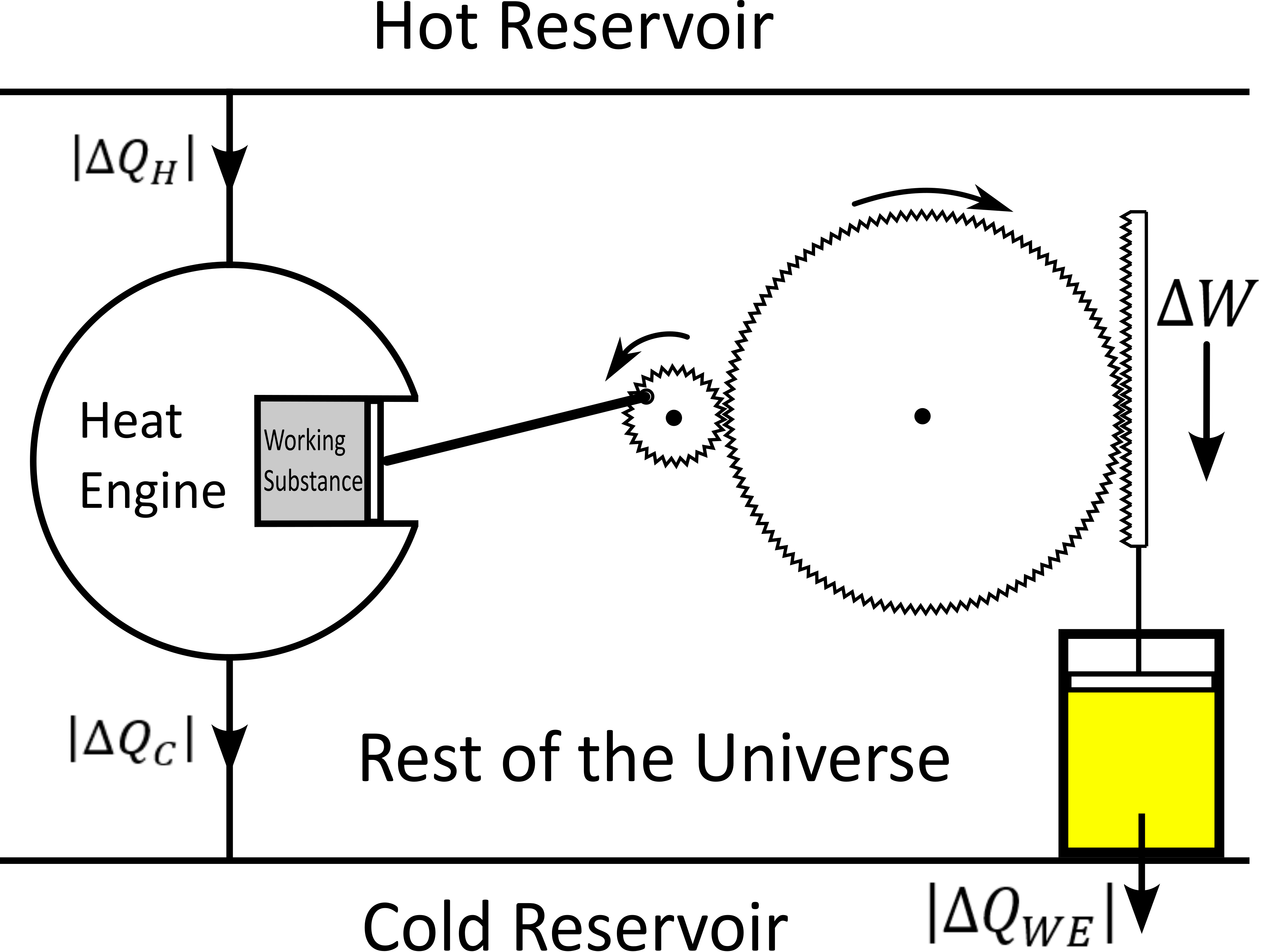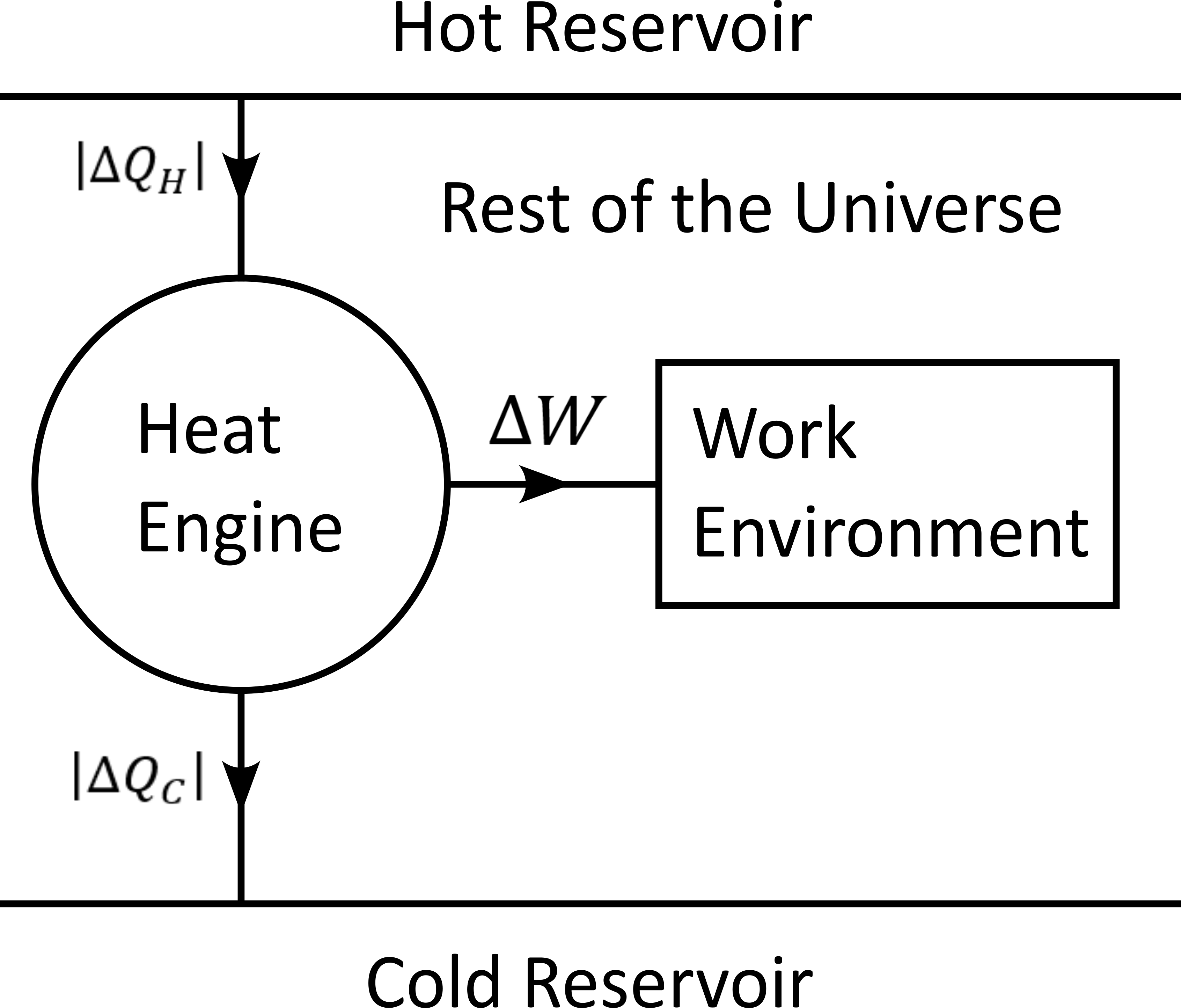 Work is the useful thing that a heat engine gives to some part of the universe that we will call the work environment. Although this “work environment” is usually not part of the thermodynamic descriptions, there is nothing wrong about it: it is just the part of the universe the heat engine is acting on. This notion will appear to be convenient for the rest of the text. The heat engine performs some work in the work environment by transferring heat from a hot to a cold reservoir. The heat engine and the working environment are two subsystems and the hot reservoir, cold reservoir and the rest of the universe are three other subsystems. Their union being the universe (the total system).