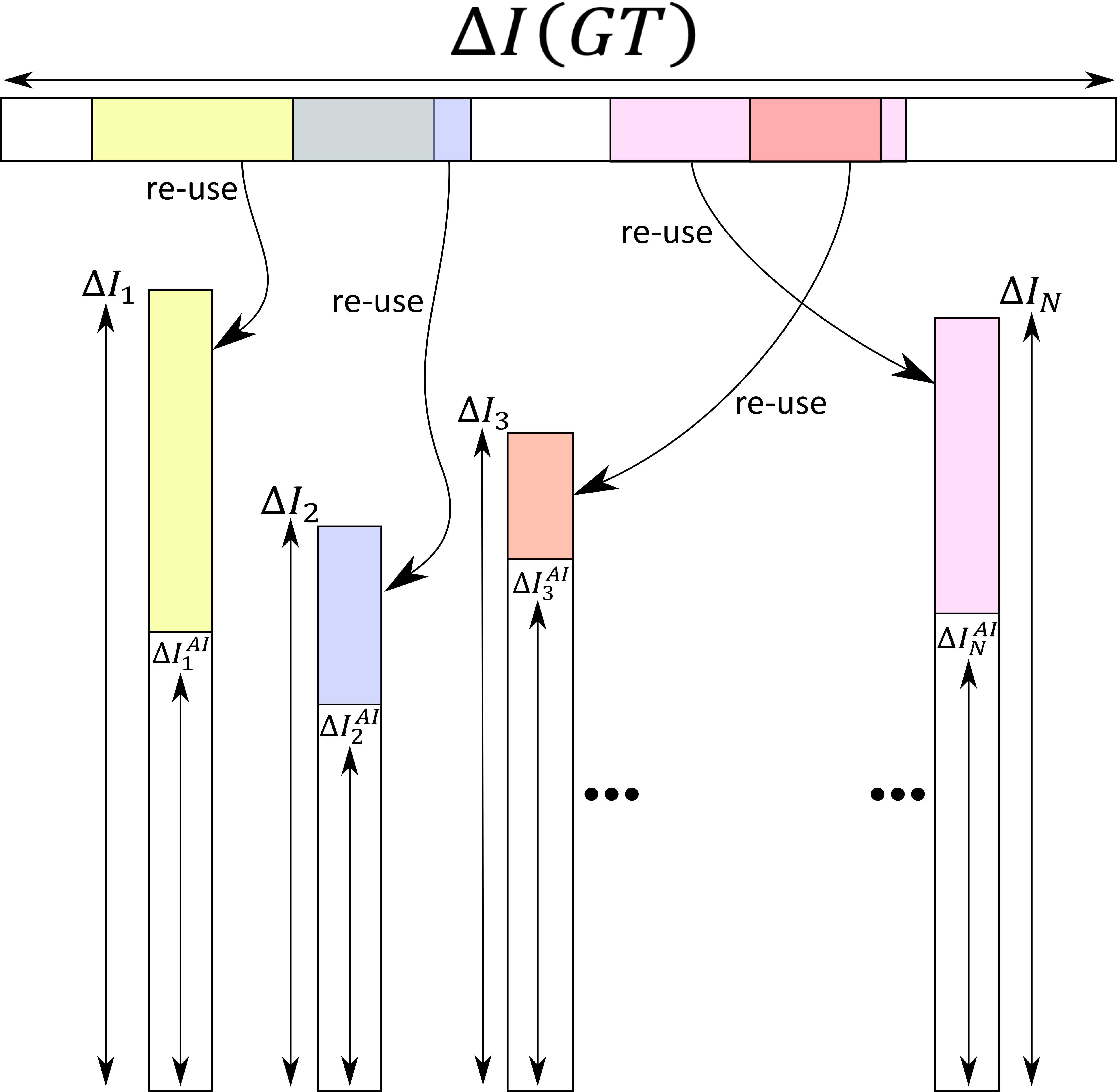 We have written \(\Delta I\left(GT\right)\) the information gained by constructing the ground truth, \(\Delta I_i\) the information gained to treat data number \(i\) with the non AI algorithm, and \(\Delta I^{AI}_i\) the information gained to treat data number \(i\) with the AI algorithm.